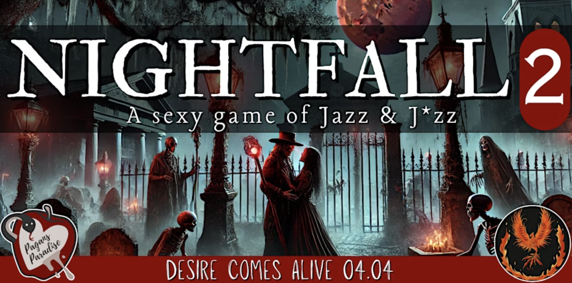 Set in New Orleans of the 1920s, Nightfall’s plot follows the emotional tug of war between the playboy & death doctor Drago, and Nix, a clingy corpse he’d reanimated. The LARP is divided into several cycles of “day” and “night”, with the “days” being timeframes devoted to meeting and negotiating BDSM scenes with other participants, and the “nights” a period dedicated to actual BDSM play: with and as zombies, death doctors or humans.