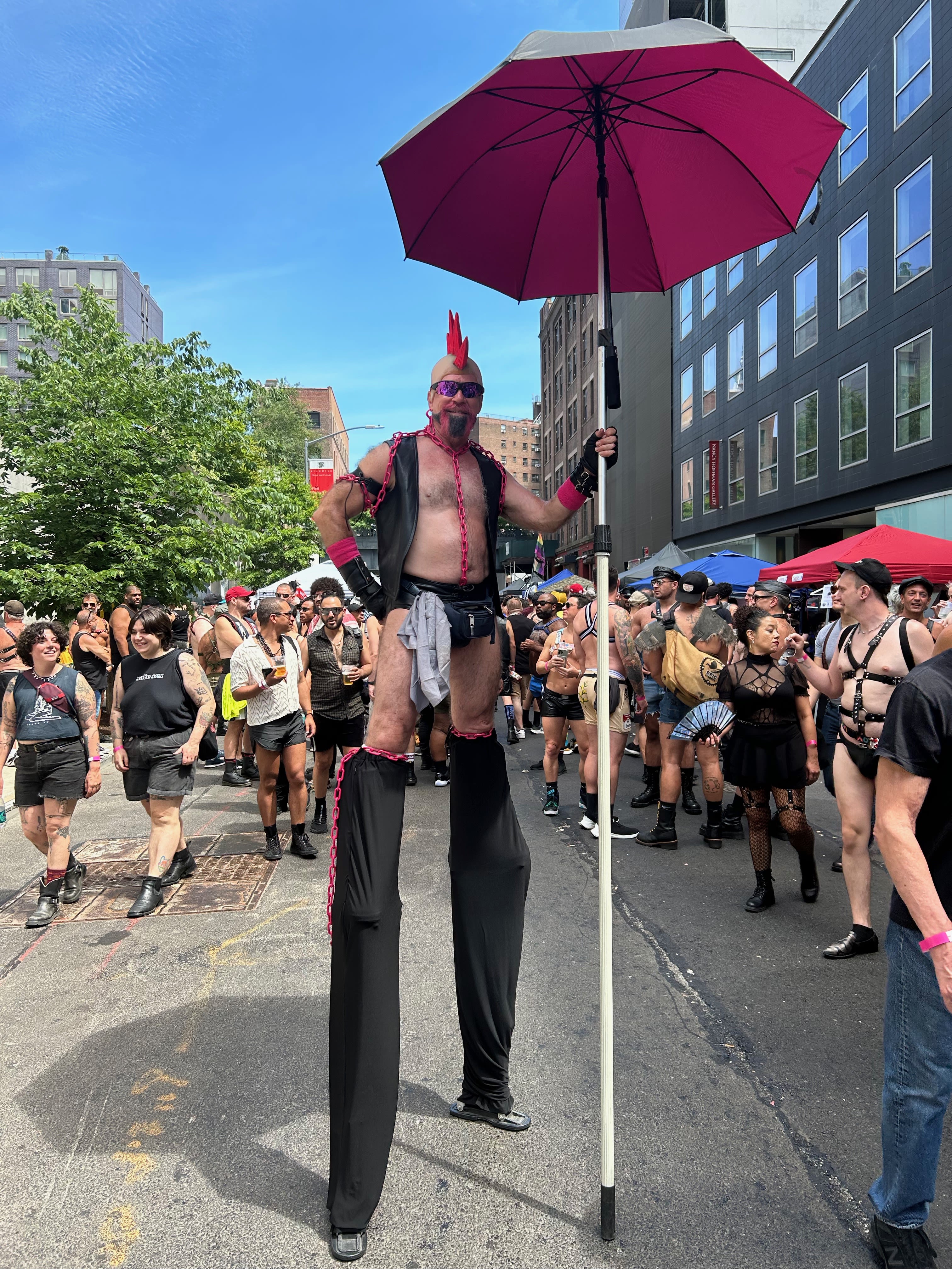 Carrying a giant pink parasol, Dale Varga, a Leatherman in his 60s in a pink mohawk wig, patrolled Folsom Street East on stilts. He’s been greeting event-goers from this high perch for the past 15 years or so, simply because “I love the people who come here.” Dale was the one interviewee with no concerns about the community's public image problems: when I asked about them, he laughed. “I lived to see ‘gay’ go from shame to pride, ‘queer’ go from an insult to a sexual orientation, and ‘fluid’ become a gender,” he said. “After all that, for kink to go from ‘kinda weird’ to ‘kinda normal’ is such a small step... that it practically already happened.”